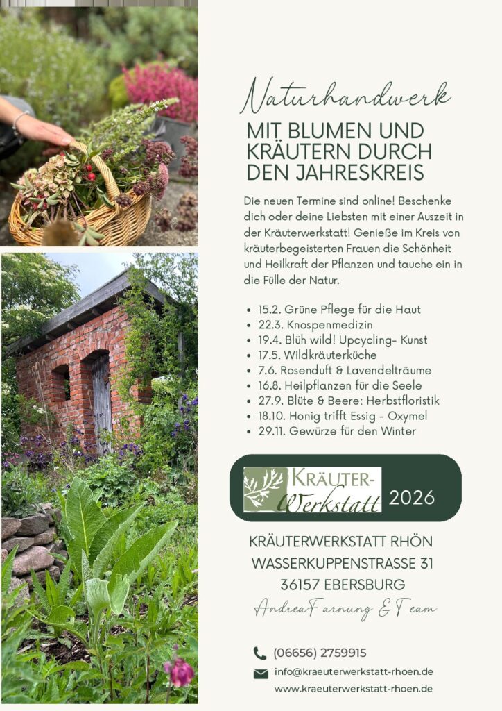 telefonisch unter 06656/2759915 (AB) oder per mail an info@kraeuterwerkstatt-rhoen.de entgegengenommen werden.